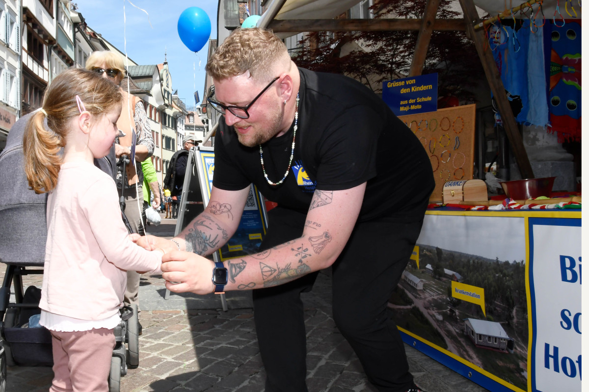 Dies war umso schöner, da die Kinder aus der Schule Maji Moto, die Perlenketten gebastelt hatten. Sie wussten, dass sie diese für den Maimarkt in der fernen Schweiz auffädeln würden. Von seiner letzten Reise nach Kenia hatte Präsident Erich Kühnis sie mit nach Altstätten gebracht.
