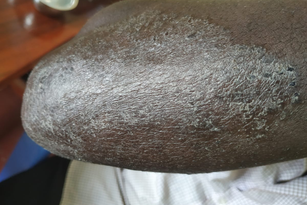 The patient has been suffering from the fungal infection for a year. It is called ringworm or (tinea corporis). It causes pink, sometimes itchy patches on the skin and has now become chronic.